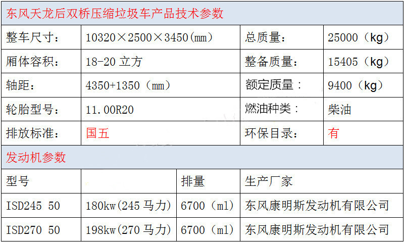 底盘配置:原装东风后双桥底盘,新款高端天龙D310带卧铺平顶驾驶室,美国进口康明斯ISDE245发动机,245马力动力,陕齿法士特8档变速箱,前桥7吨,双10吨后桥,1100-20原厂钢丝胎轮胎带备胎,气刹,断气刹,排气制动,带原装冷暖空调,带ABS,带北斗定位的行车记录仪。